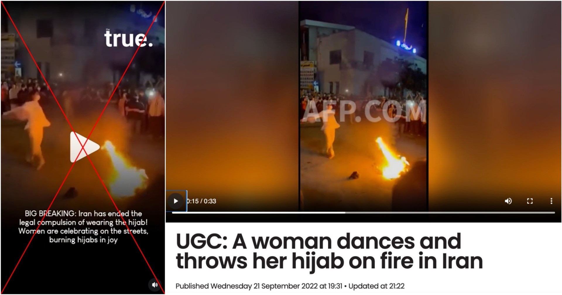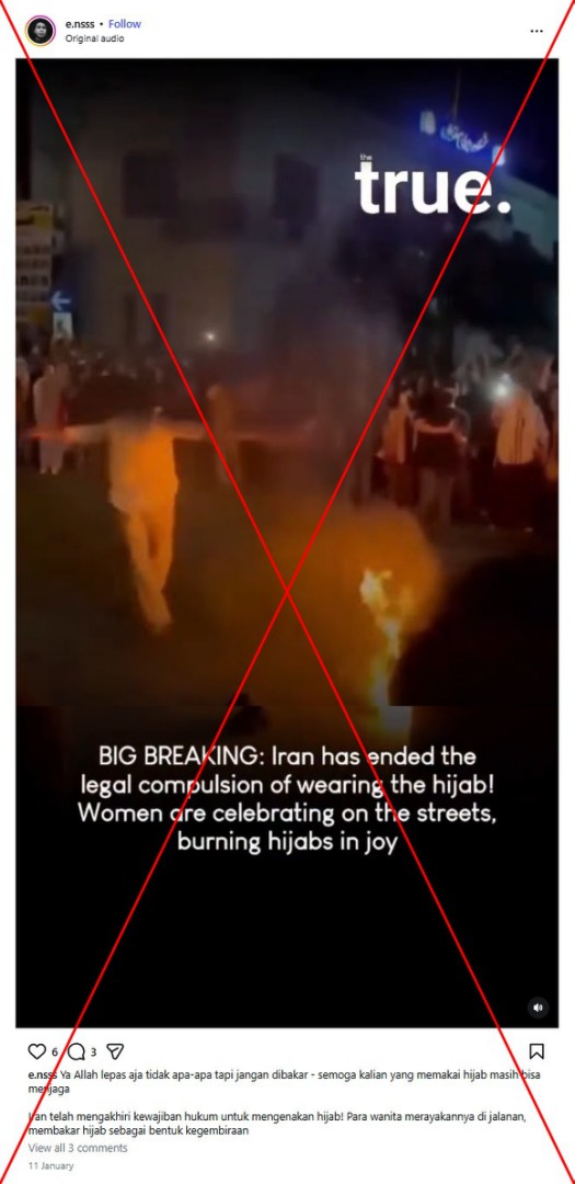Di tengah gelombang demonstrasi besar-besaran di Iran, beredar video seorang wanita menari lalu melemparkan jilbabnya ke api unggun dan diklaim sebagai rekaman perayaan berakhirnya kewajiban menggunakan hijab di negara tersebut. Meski para analis dan aktivis mengatakan telah terjadi kelonggaran terhadap penegakan hukum kewajiban berhijab beberapa tahun terakhir, namun hingga kini Iran belum mencabut aturan tersebut. Dan faktanya, video itu diambil tahun 2022 saat terjadi protes atas kematian seorang perempuan setelah ditahan polisi karena tidak mengenakan hijab dengan benar.